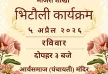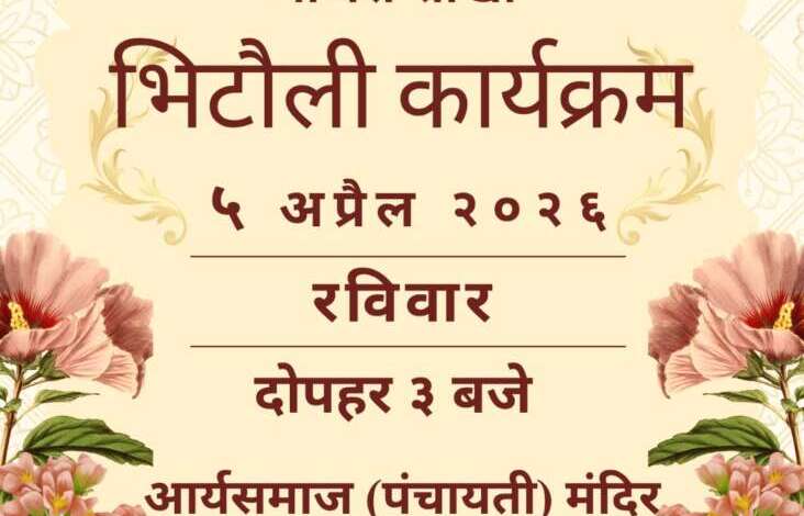 देहरादून। कूर्मांचल सांस्कृतिक एवं कल्याण परिषद, शिवालिक रेंज, धर्मपुर विधानसभा क्षेत्र की माजरा शाखा द्वारा भिटौली कार्यक्रम का आयोजन 5 अप्रैल 2026 (रविवार) को किया जा रहा है। यह कार्यक्रम दोपहर 3:00 बजे से आर्य समाज (पंचायती) मंदिर, सुभाषनगर, क्लेमेंटाउन, देहरादून में आयोजित होगा।