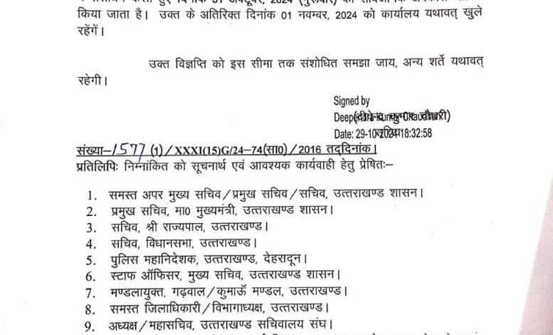 उत्तराखण्ड राज्य में सार्वजनिक अवकाश घोषित किये जाने विषयक अधिसूचना संख्या-1881/xxxi (15) G/23-74 (सा0)/2016, दिनांक 26 दिसम्बर, 2023 के द्वारा दीपावली पर्व हेतु घोषित सार्वजनिक अवकाश दिनांक 01 नवम्बर, 2024 (शुक्रवार) में संशोधन करते हुए दिनांक 31 अक्टूबर, 2024 (गुरुवार) को सार्वजनिक अवकाश घोषित किया जाता है। उक्त के अतिरिक्त दिनांक 01 नवम्बर, 2024 को कार्यालय यथावत् खुले रहेंगें।उक्त विज्ञप्ति को इस सीमा तक संशोधित समझा जाय, अन्य शर्ते यथावत्