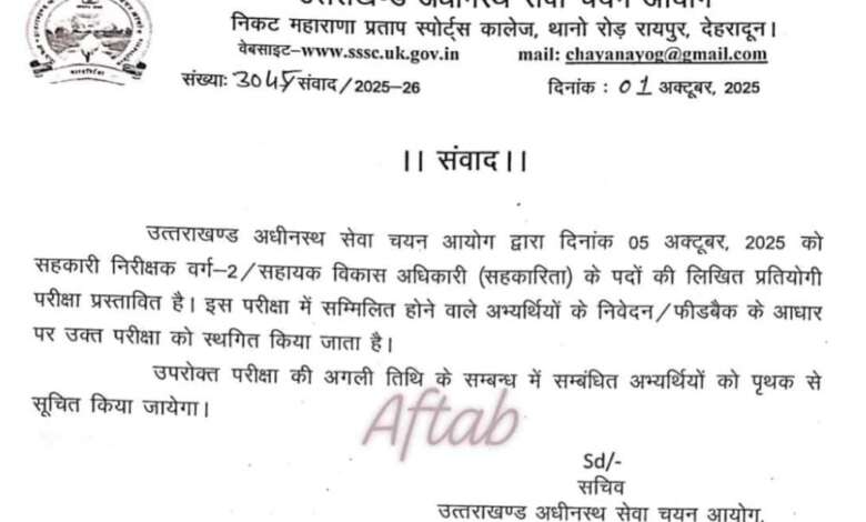 उत्तराखण्ड अधीनस्थ सेवा चयन आयोग द्वारा दिनांक 05 अक्टूबर, 2025 को सहकारी निरीक्षक वर्ग-2/ सहायक विकास अधिकारी (सहकारिता) के पदों की लिखित प्रतियोगी परीक्षा प्रस्तावित है। इस परीक्षा में सम्मिलित होने वाले अभ्यर्थियों के निवेदन / फीडबैक के आधार पर उक्त परीक्षा को स्थगित किया जाता है।