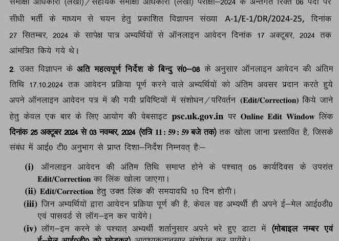 हेतु केवल एक बार के लिए आयोग की वेबसाइट psc.uk.gov.in पर Online Edit Window लिंक दिनांक 25 अक्टूबर 2024 से 03 नवम्बर, 2024 (रात्रि 11:59:59 बजे तक) तक खोला जाना प्रस्तावित है, जिसके