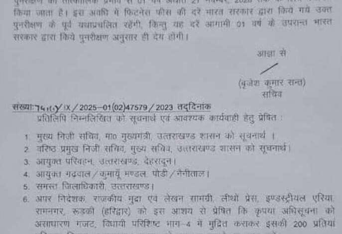 उत्तराखंड में एक वर्ष तक नहीं बढ़ेगी वाहन फिटनेस फीस, आदेश जारी